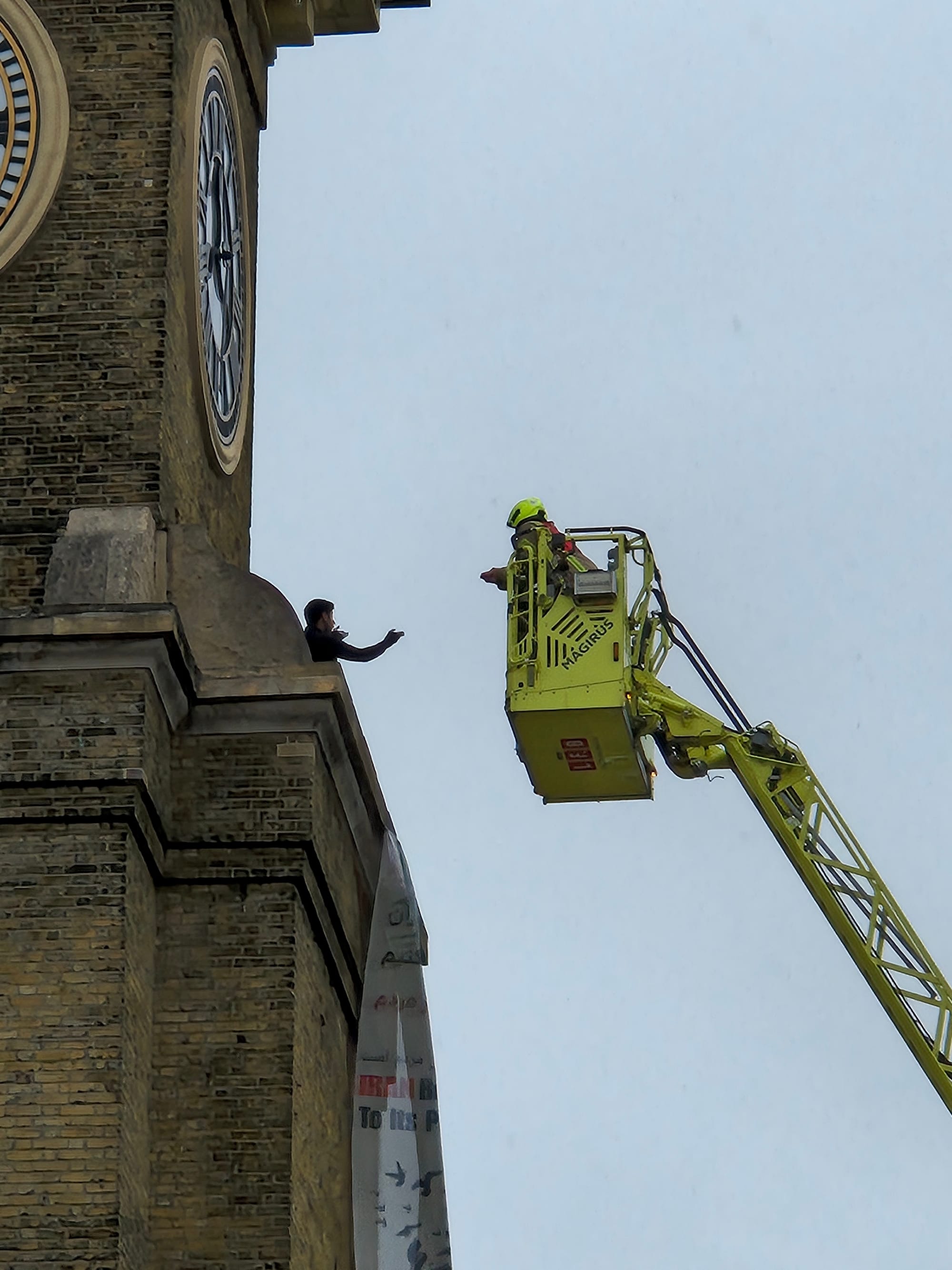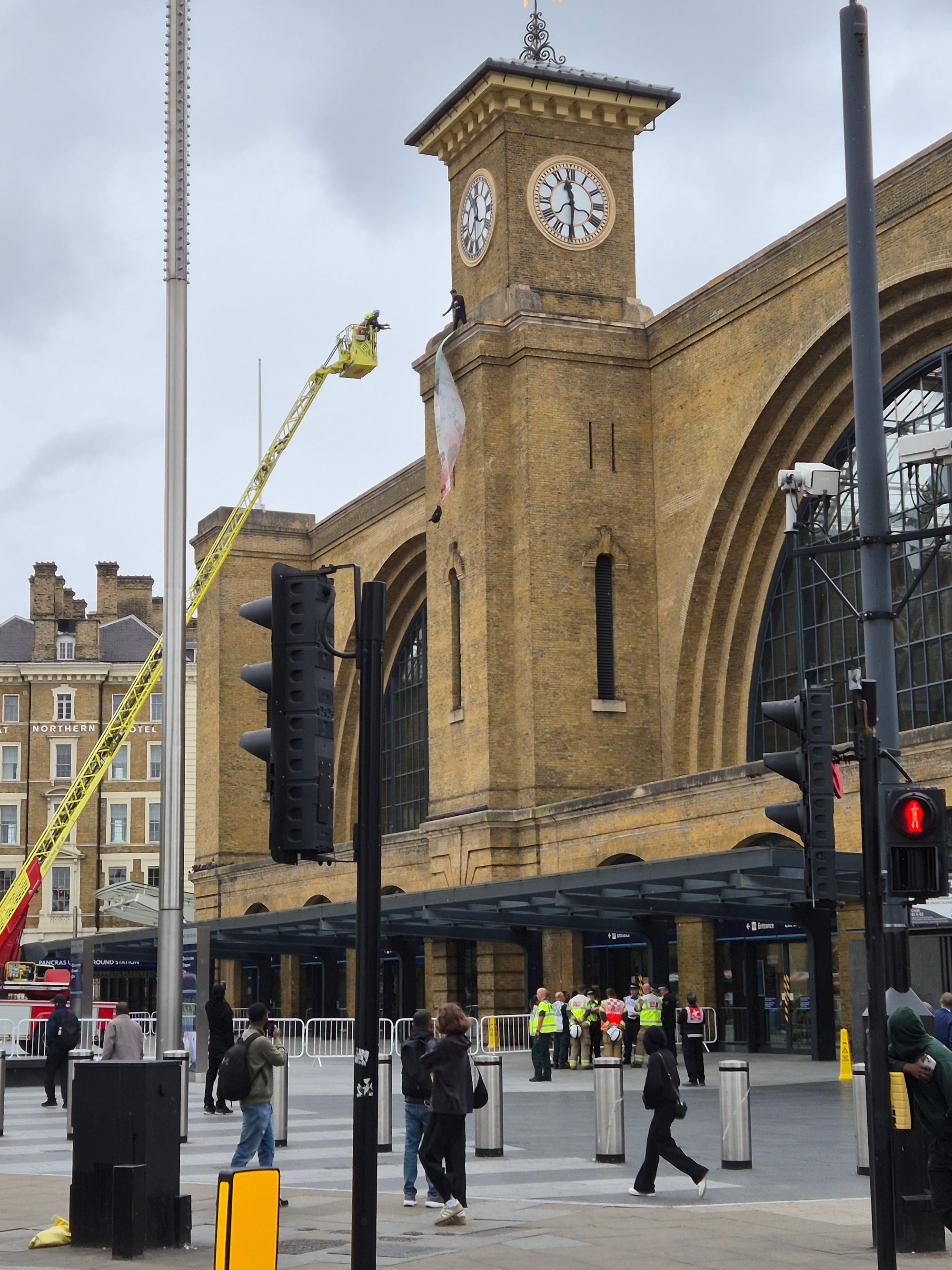 There's a man and a dog up on a ledge at the top of the Kings Cross Station clock tower. The funny thing is, nobody really stops to look. Everybody just walking by like it's nothng. Lots of police and a negotiator atop a crane lift. It's a young man holding a little fluffy dog, arguing with the negotiator above his banner "Iran belongs to its people - Freedom for Iran."
